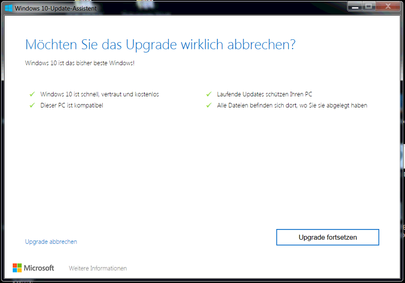 Versuchte man das Upgrade mittels Windows 10 Upgrade-Assistent meldet dieser zunächst das der Computer kompatibel sei, läd alles herunterladen und dann dennoch die gleiche Meldung. Bricht man an dieser Stelle ab, erhält man wenigstens den Fehlercode “0xc1900205”, der kann wiederum relativ viel bedeuten und könnte zudem einfach durch den manuellen Abbruch des Assistenten zustande gekommen sein.