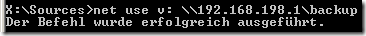 Hat man es dann soweit geschafft, kann über net use die Netzwerk-Freigabe des anderen PCs, Servers, NAS, whatever eingebunden werden und von hier aus dann z.B. ein Image zurückgespielt werden.