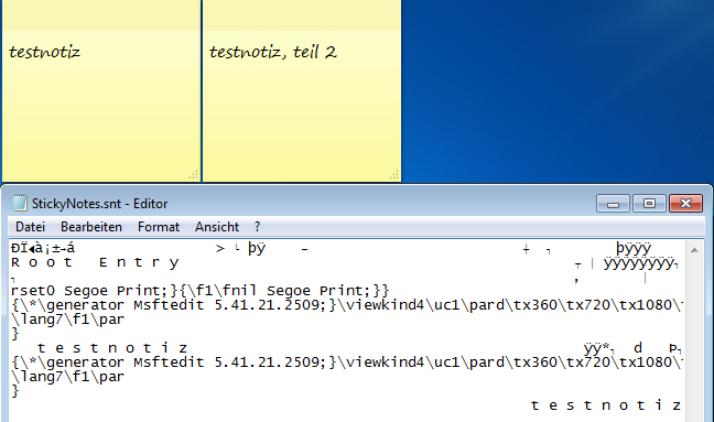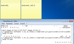 Dort liegt eine Datei mit dem Namen StickyNotes.snt. Darin sind alle Notizen enthalten. Leider ist das Datei-Format nicht ohne weiteres lesbar. Die eigentliche Notiz ist erkennbar, allerdings keine Formatierung.