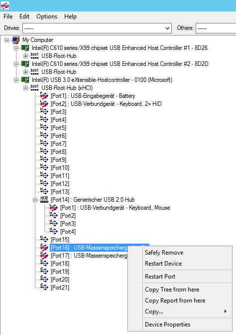 Die USB-Festplatte als solches ist dabei in Ordnung, offenbar hängt sich beim Reaktivieren entweder der Port, der Hub oder das Gerät selbst auf. Whatever. Mit dem obigen devcon und weiteren Tools wie z.B. EjectMedia, RemoveDrive oder RestartSrDev ist das leider bislang nicht lösbar gewesen, allerdings mit USB Device Tree Viewer schon: