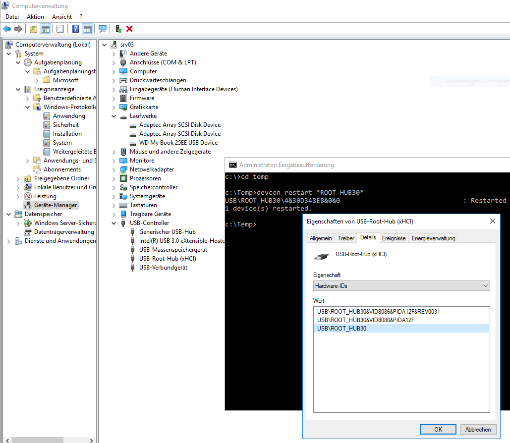 Bei einem Kunden kommt es immer wieder vor, das nach dem Wechsel der USB-Festplatte für die Datensicherung diese nicht auf Anhieb oder selbst nach mehrmaligen ab-/anstecken nicht erkannt wird. Mit dem gezielten Neustart klappt es dann doch, ohne das der PC oder in diesem Fall der Server neu gestartet werden muss.