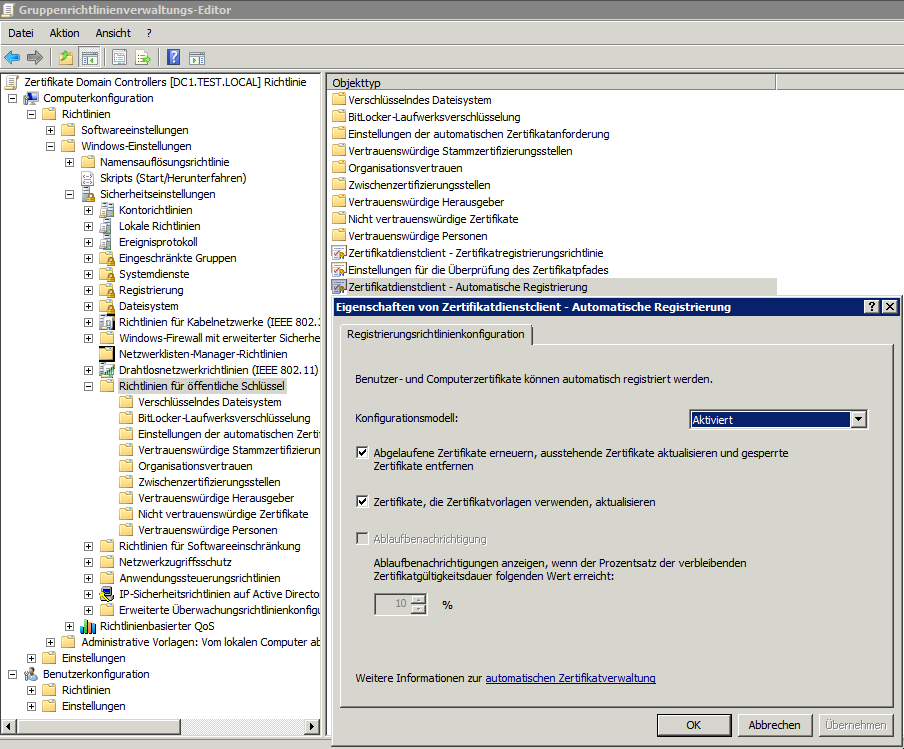 Computerkonfiguration – Richtlinien – Windows-Einstellungen – Sicherheitseinstellungen – Richtlinien für öffentliche Schlüssel – Einstellungen der automatischen Zertifikatsanforderung