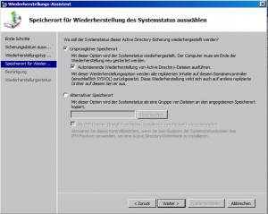 Ab Windows Server 2008 R2 kann man direkt in der GUI zum Wiederherstellen des Systemstatus’ angeben, das eine autorisierende Wiederherstellung des Active Directory durchgeführt soll.