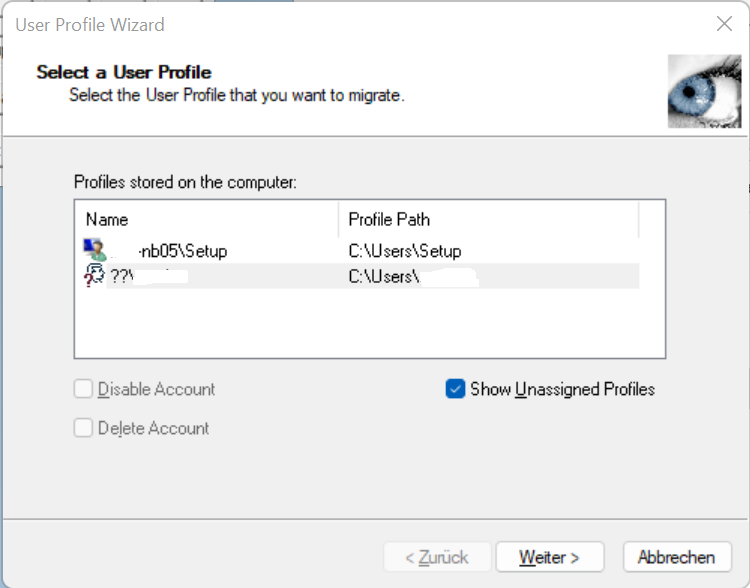 Den Haken setzen bei “Show Unassigned Profiles”, so werden alle im Dateisystem vorhandenen Benutzerprofile angezeigt. Nun das Benutzerprofil auswählen.