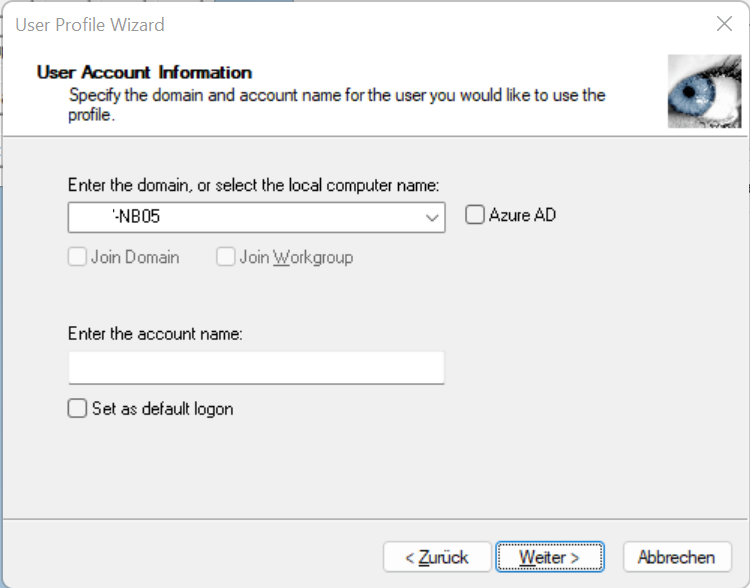 Bei Domänen-Computer die Domäne und bei Einzelplatz-/Arbeitsgruppen-Computern den lokalen Computernamen auswählen bzw. eingeben. Ferner den lokalen oder den Domänen-Benutzer angeben dem das Benutzerprofil zugewiesen werden soll.