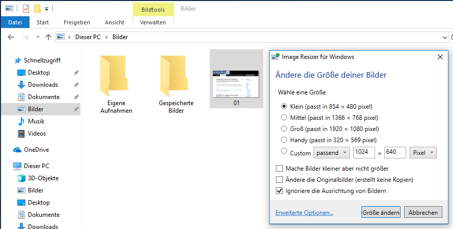 Die Namensgebung ist konfigurierbar. Die Originaldatei wird nicht verändert, außer man konfiguriert das Tool entsprechend. Eigene Größen lassen sich zudem einstellen. Mehrere Bilder können auf einen Schlag geändert werden, diese dazu Auswählen und wie zuvor beschrieben vorgehen.