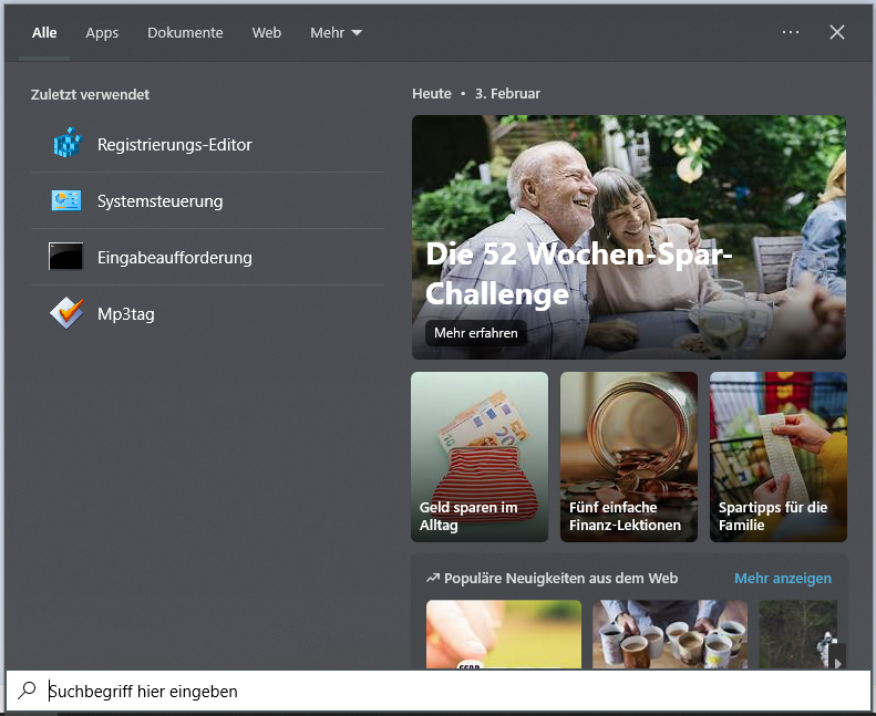 Ab Werk zeigt das Fenster der Windows-Suche Anzeigen und Ergebnisse von Microsoft’s Suchmaschine Bing an. Mitunter ist das nicht gewünscht.