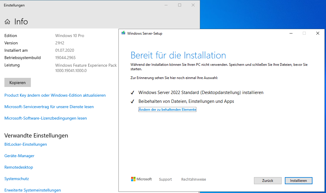 Anschließend startet man von einer eingehängtem “Windows Server 2022 Standard.iso” die “Setup.exe”. Man wählt die Edition mit der Desktopdarstellung aus, bestätigt das alle Apps und Daten übernommen werden sollen und dann läuft es los.