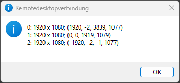 Microsoft bietet hierzu, wenn auch leider etwas umständlich zu konfigurieren, eine Möglichkeit dies einzustellen. Zunächst muss die gewünschte Verbindung in Form einer *.rdp-Datei vorliegen bzw. gespeichert werden. Der oben erwähnte Haken muss zudem gesetzt sein. Als nächstes ruft man im Terminal oder der Eingabeaufforderung folgenden Befehl auf um die aktuelle Monitor-Konfiguration zu ermitteln: