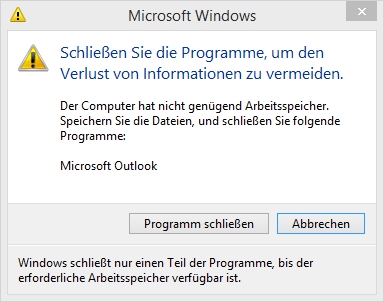 Windows 8.1 - Nicht genügend ArbeitsspeicherIm Screenshot wird speziell Outlook erwähnt, die gleiche Meldung erschien allerdings auch ohne explizit genannte Anwendung. So manche Anwendung wie z.B. Google Chrome stürzten zudem häufig ab. Auffällig war, das nur 60% des Arbeitsspeichers belegt waren und somit eigentlich genug Ressourcen frei sind. Eine Recherche nach besagter Meldung lieferte mehrere potentiell interessante Treffer: