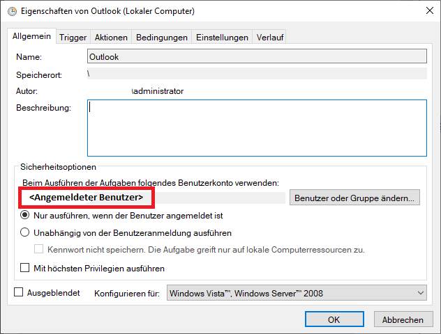 So kam der Gedanke auf Outlook im Kontext des Benutzers auszuführen. Also kurzerhand eine Aufgabe erstellt, die nur für diesen Benutzer gilt und diese dann ausgeführt: