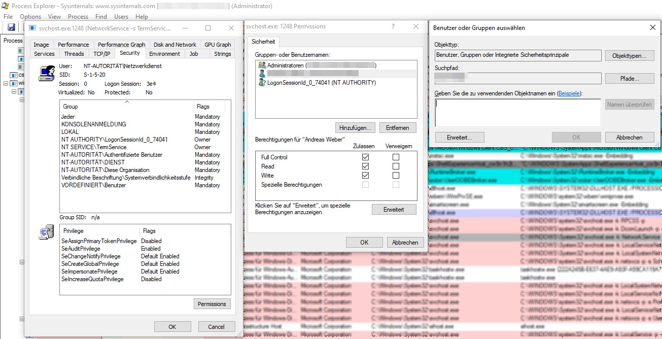 Startet man den Process Explorer und blendet die entsprechenden Spalten “Path” und “Command Line” ein, so lässt sich der passende Prozess relativ leicht finden. Aus dem Kontextmenü des betreffenden Prozesses die “Properties” aufrufen, zur Registerkarte “Security” wechseln und auf “Permissions” klicken. Ab hier kann wie gewohnt nach Benutzern gesucht und diesen Rechte erteilt werden: