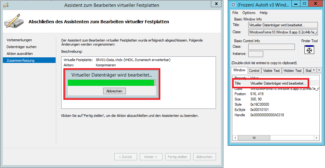 Mit Hilfe eines kleines AutoIt-Skripts kann man sich Anzeigen lassen, wann der Vorgang abgeschlossen wurde. Als Basis dient dafür das Vorhandensein dies Fenster mit dem Titel “Virtueller Datenträger wird bearbeitet…”, welches nur vorhanden ist, während eine direkte Bearbeitung einer VHDX stattfindet: