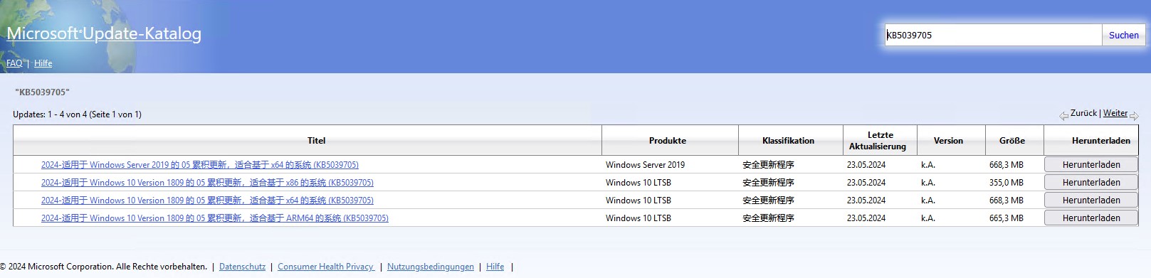 Warum (in jedem Browser auf diesem System) der Microsoft Update-Catalog für das Update KB5039705 asiatische Schrift verwendet bleibt ein Rätsel. Im System und den Browsern ist weder eine andere Sprache eingestellt noch sind weitere Sprachpakete installiert.
