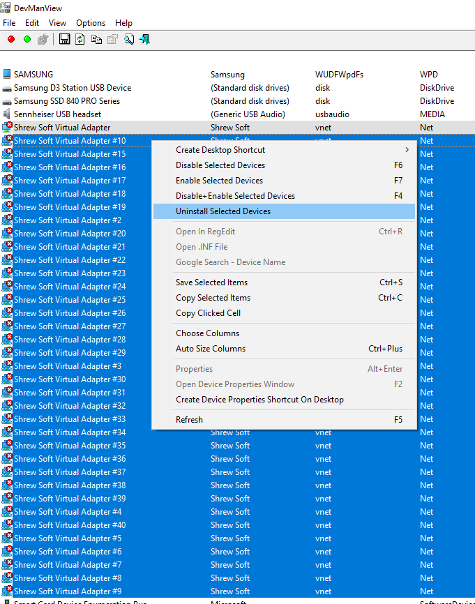 Schneller und einfache klappt das Vorhaben mit DevManView von Nir Sofer (aka NirSoft). Einfach das Tool herunterladen, entpacken und mit erhöhten Rechten starten. Die zu deinstallierneden Geräte auswählen und aus dem Kontextmenü “Uninstall Select Devices” auswählen.