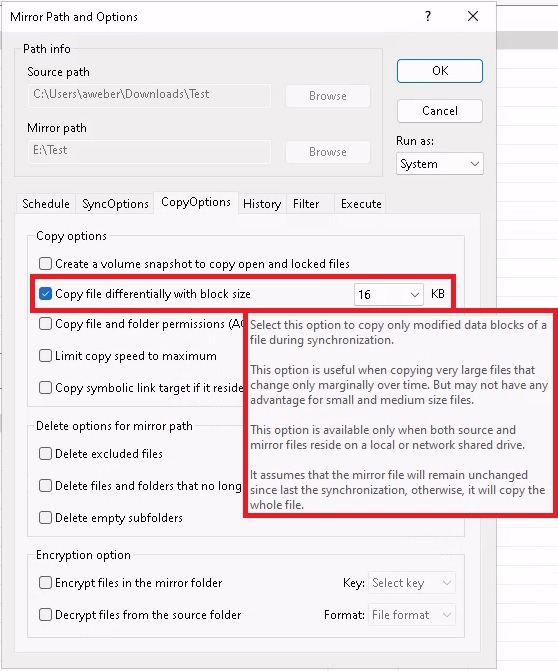 Aber offenbar kann dennoch auf Block-Ebene abgeglichen werden, wenn man in den “CopyOptions” folgendes aktiviert: