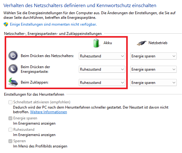 Je nach Versionsstand der verwendeten Windows-Version unterscheiden sich die Möglichkeiten die man zum Deaktivieren des Modern Standby hat. Darüber hinaus muss beachtet werden, das zwischen “Mit Netzteil verbunden” (AC) und “Akku-Betrieb” (DC) unterschieden wird.