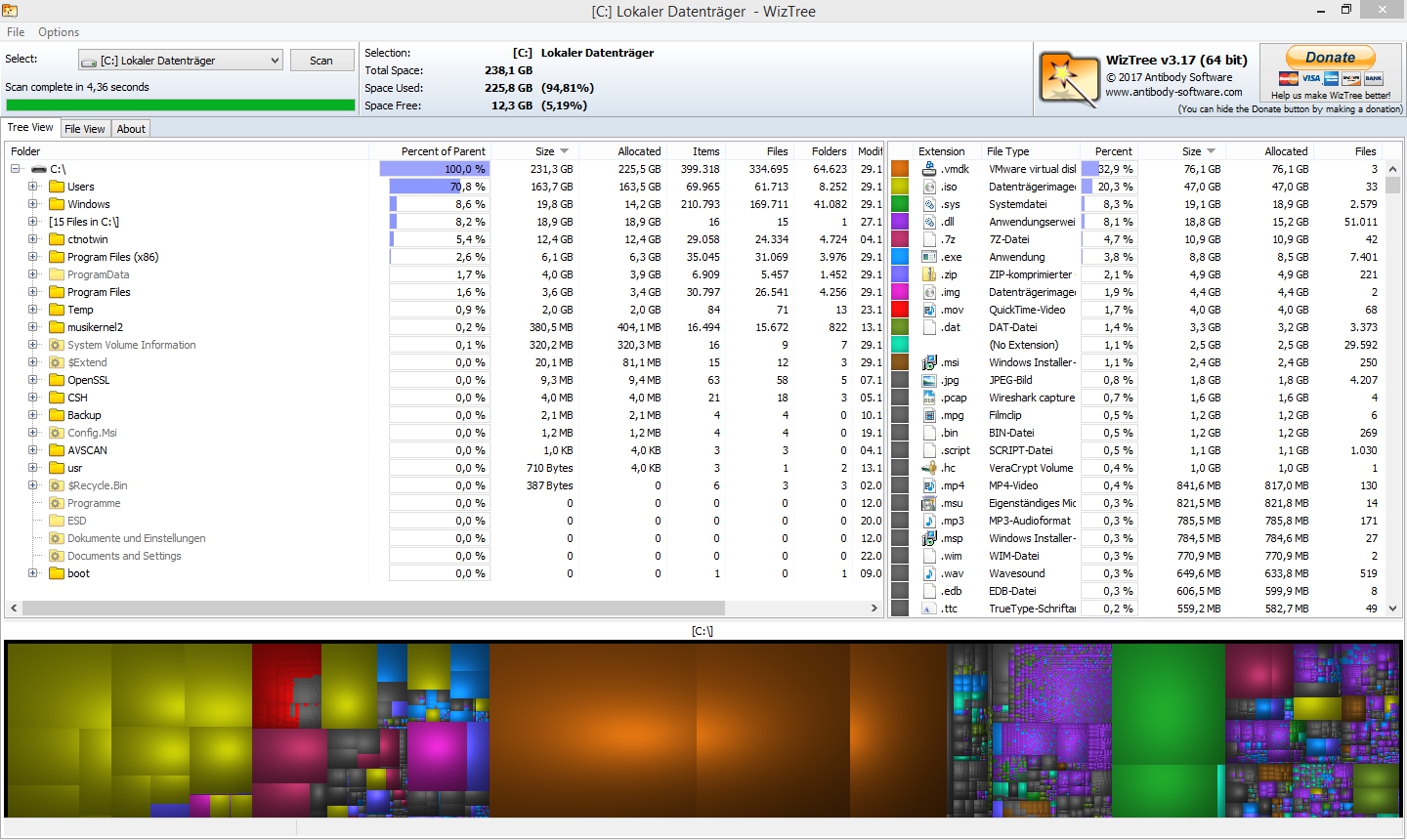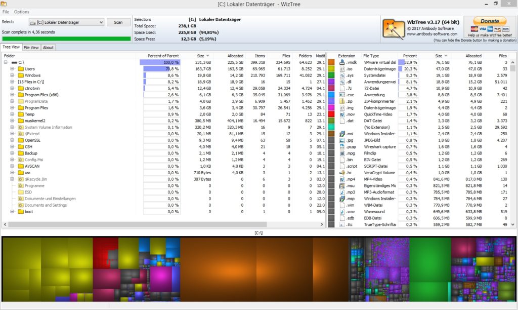 Das krasse Gegenteil stellt dann WinDirStat (Portable) dar, das erst im zweiten Anlauf und mit erheblicher Wartezeit zum Abschluss kam.