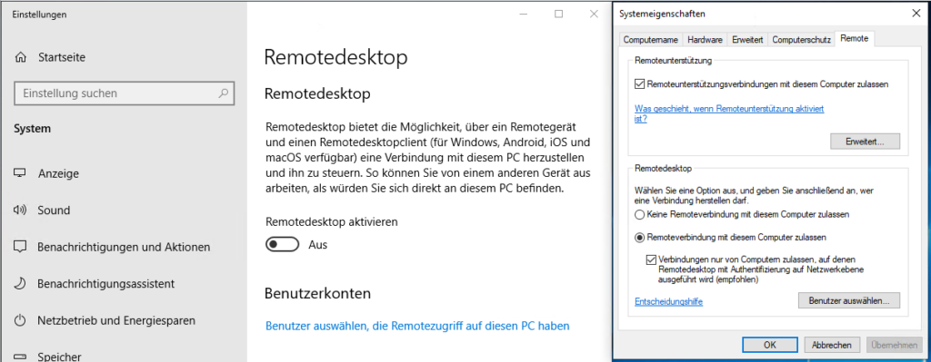 Ob RDP aktiv ist oder nicht, sollte man einfach via Einstellungen oder Systemsteuerung klären können. Bei meinem Testsystem fiel mir folgendes auf: