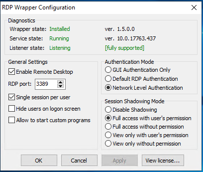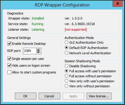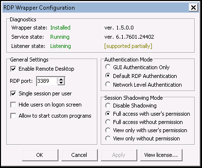 • Status des RDP Wrapper (gemeint ist das was die “RDPconf.exe” anzeigt)