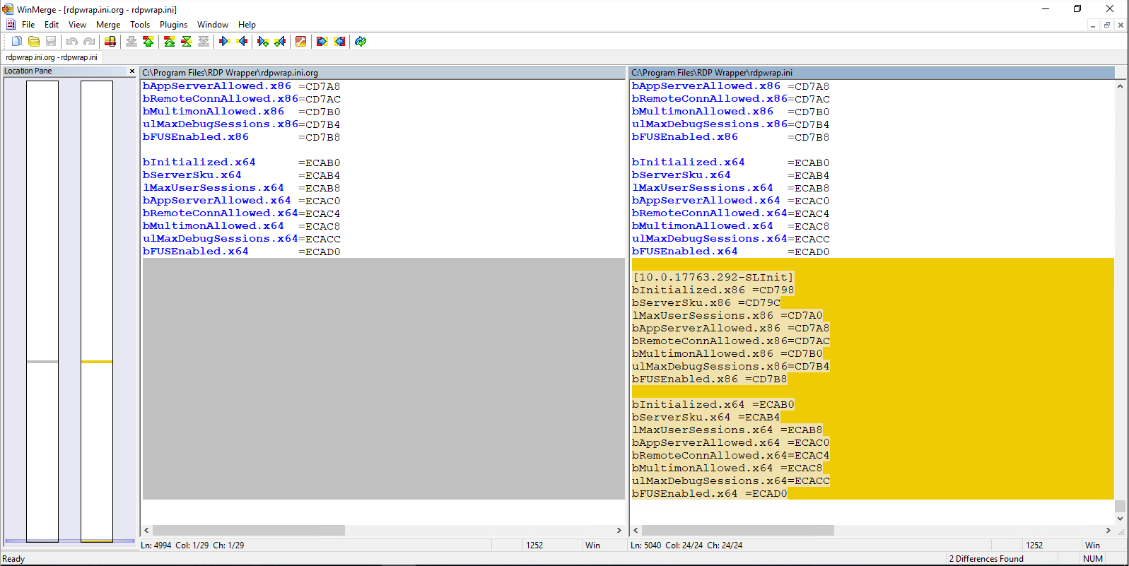Vergleich der original und der aktualisierten “rdpwrap.ini”
