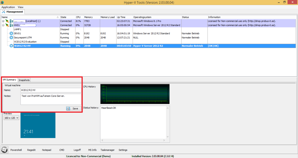 Ein weiterer Pluspunkt ist ein Kommentarfeld (Notes) pro virtuellem Computer. Dort können Notizen wie z.B. Server-Rollen, Funktion der VM o.ä. eingetragen werden. Dies kennt man sonst z.B. eher von Proxmox VE oder VMware. Im Hyper-V-Manager von Microsoft kann man ebenfalls Anmerkungen hinterlegen, allerdings muss man dies in den Einstellungen des virtuellen Computers vornehmen. Der Weg bei ProHVM ist kürzer.