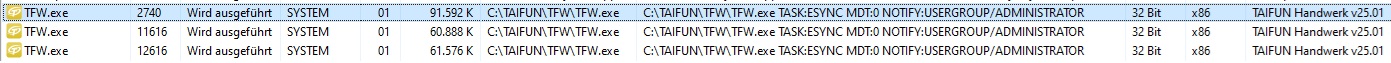 Das zu diesem Zeitpunkt aktuelle TAIFUN-Update bringt leider ein paar Nebenwirkungen mit sich. So sammeln sich mitunter auf einem Terminalserver (Windows Server 2022) innerhalb kurzer Zeit massig folgende Prozesse:
