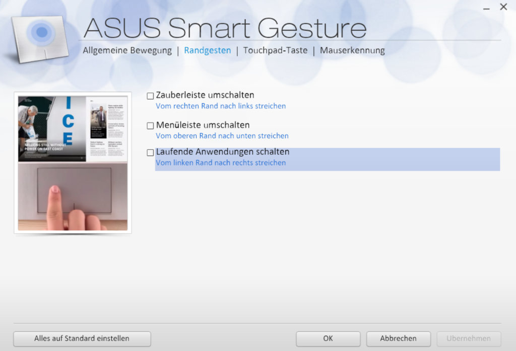 Bei neueren Notebooks (nicht nur von ASUS) kommen in Verbindung mit Windows 8.x Randgesten zum Einsatz. Mit diesen Gesten, die auf dem Touch- oder Mauspad jeweils vom Rand aus (oben, links, rechts) ausgeführt werden, öffnen z.B. die Charm-Leiste.
