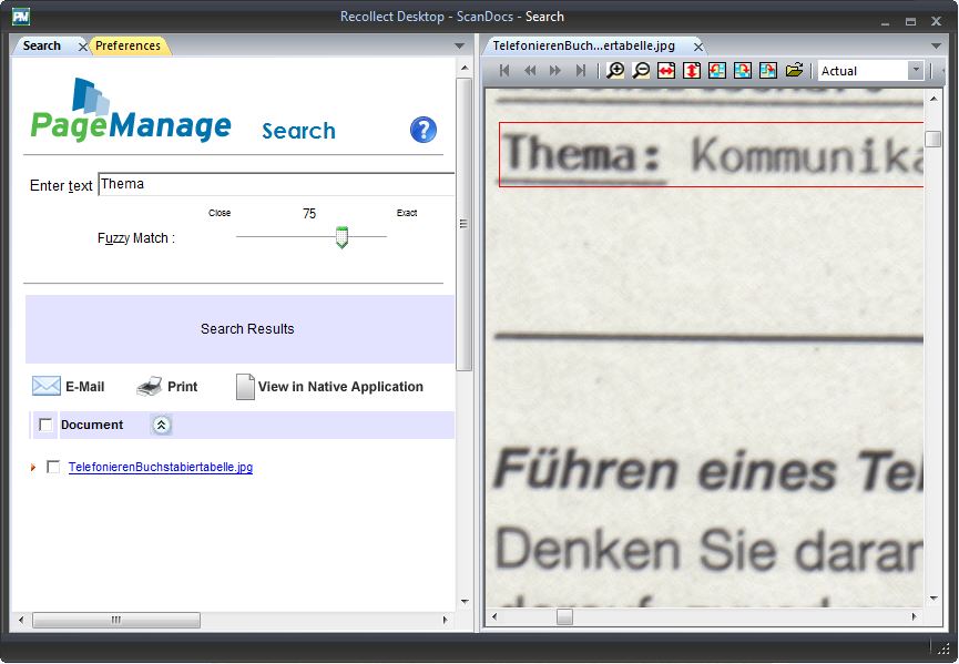 Die Anwendung Recollect ScanDocs bietet die Möglichkeit, eingescannte Dokumente mittels OCR zu indexieren. Dadurch entsteht in Verbindung mit einem Multifunktionsgerät, wie z.B. dem Muratec MFX-5270, und der Funktion Fax-Archivierung die Möglichkeit, durchsuchbare Fax-Archive, die alle empfangenen als auch gesendeten Faxe enthalten, zu erstellen.