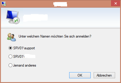 Bestehen mehrere Sitzungen und es wird eine weitere RemoteApp geöffnet, wird nachgefragt, mit welchem Benutzer, eigentlich ist die vorhandene Sitzung gemeint, verwendet werden soll: