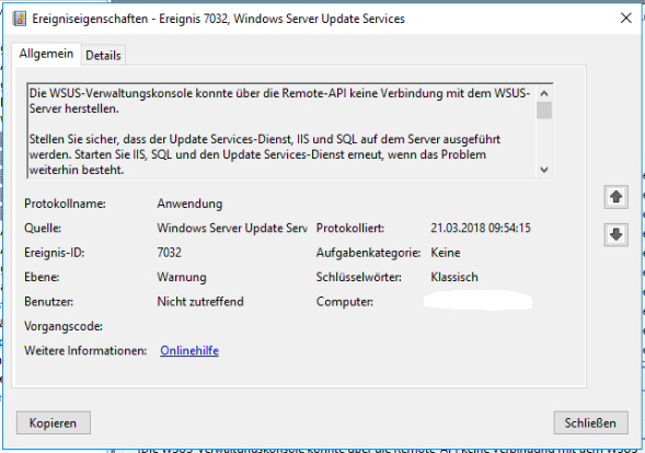 Die Installation der Updates verlief gewohnt lahm aber erfolgreich durch. Der notwendige Neustart klappte ebenso. Allerdings war anschließend keine Verbindung der WSUS-Verwaltungsoberfläche möglich. Im Ereignisprotokoll fand sich dies: