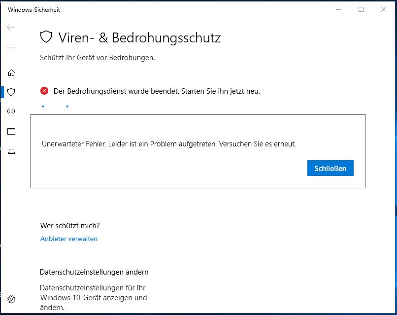 Das Windows Update-Protokoll das man via Powershell (Get-WindowsUpdateLog) generieren kann lieferte zunächst keinen brauchbaren Hinweis. Der Windows-Update-Dienst lies sich zudem nicht ohne weiteres Beenden, lediglich ein “Abschießen” des Prozesses half. Ein Reset der Windows-Update-Komponenten half ebenfalls nicht, genauso wenig wie das manuelle Herunterladen und Installieren der Updates. Letztgenanntes suchte ebenfalls endlos. Per Zufall fiel dann auf, das der Defender-Dienst abgestürtzt war und sich nicht mehr starten lies: