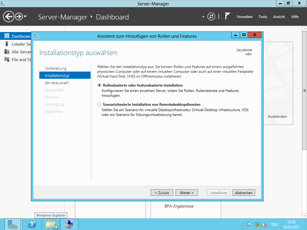 Um Active Directory auf einem Windows Server 8 mit grafischer Oberfläche zu installieren, klickt man im Dashboard des Server-Managers auf “Rollen und Features hinzufügen”. Es startet ein Assistent wie auch schon bei Windows Server 2008 mit der Vorbemerkungen-Seite. Nachdem man auf “Weiter” geklickt hat kann man auswählen, ob man eine “rollenbasierte oder featurebasierte Installation” oder eine “Szenariobasierte Installation von Remotedesktopdiensten” durchführen möchte. Hintergrund dieser Auswahlmöglichkeit ist, das Microsoft das Installieren und Einrichten einer VDI-Umgebung vereinfachen möchte. Da es in diesem Artikel um die Einrichtung eines Servers für kleine und mittlere Umgebungen geht und an dieser Stelle ein Active Directory Domänencontroller eingerichtet werden soll, wählt man den ersten Menüpunkt aus.
