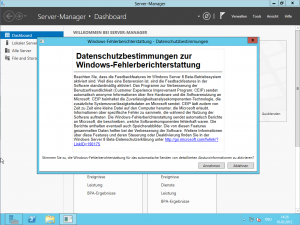 Direkt nach der Anmeldung startet der Server-Manager und es erscheint ein Fenster mit der Datenschutzbestimmung für die Fehlerberichterstattung.