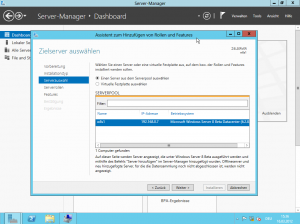 In der nächsten Auswahl kann man den oder die Server auswählen, auf denen die neue Rolle oder das neue Feature installiert werden sollen. Zusätzlich besteht die Möglichkeit, einen virtuelle Festplatte (VHD) auszuwählen. Spätestens an dieser Stelle spürt man die Möglichkeiten des neuen Server-Managers sehr deutlich.