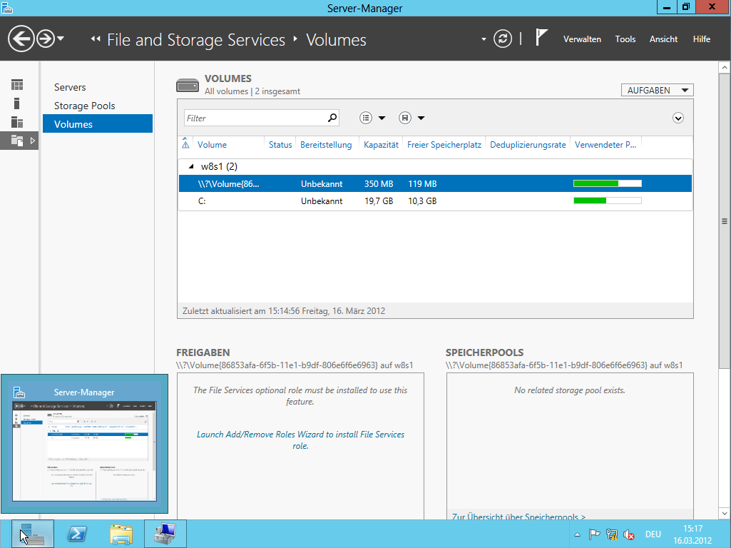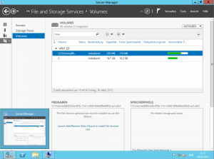 Wirft man einen Blick in die Datenträgerverwaltung (“Tools – Computerverwaltung” oder “File and Storage Services” – “Volumes” so fällt auf, das die Boot-Partition nicht mehr 100 MB sondern 350 MB groß ist.