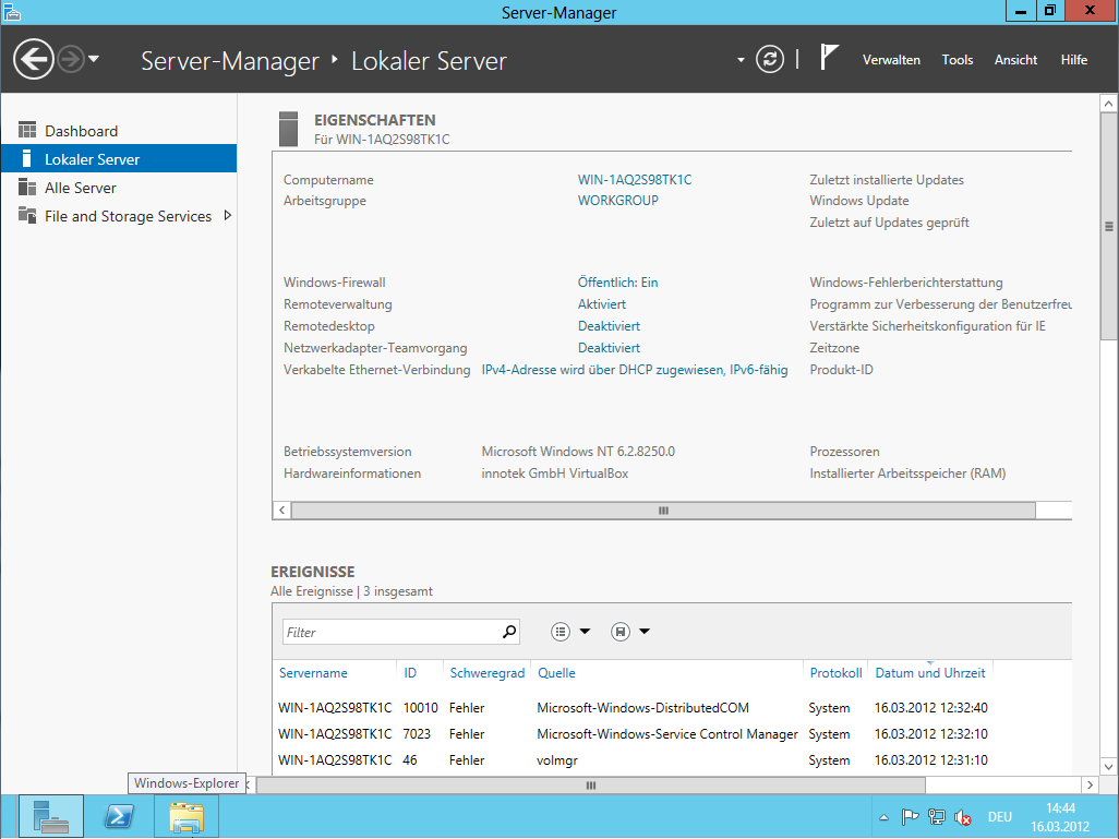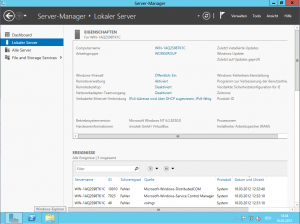 Klickt man im Dashboard des Server-Managers auf “Diesen Server konfigurieren” gelangt man direkt im Menü “Lokaler Server”. Von hier aus können der Computername, die Domäne oder Arbeitsgruppe, die Firewall und weitere Punkte konfiguriert werden. Für die Grundkonfiguration wird in der Regel der Computername geändert, die IP-Adresse manuell konfiguriert und Remotedesktop aktiviert. Ferner sollten vor der Installation von Server-Rollen die aktuellen Windows Updates installiert werden.