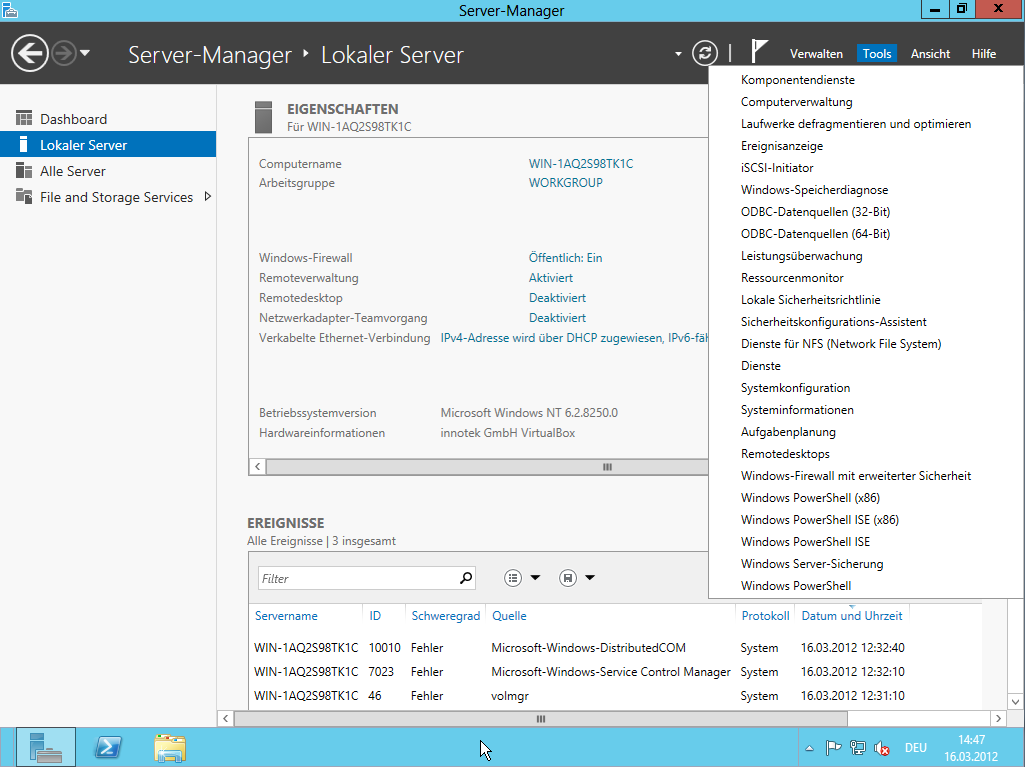 Für den schnellen Zugriff auf die bereits bekannten und gewohnten Tools steht der Menüpunkt “Tools”, recht oben im Server-Manager zur Verfügung.