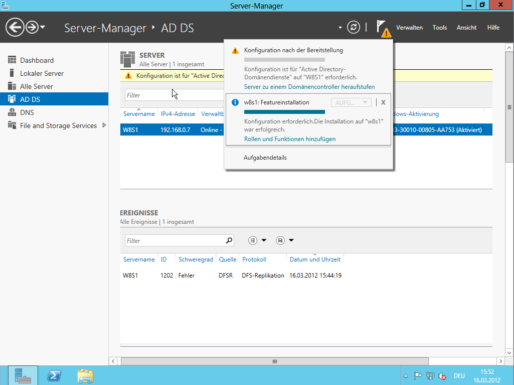 Etwas verwirrend und ungewohnt ist, das zwar die Rollen und Features installiert werden, aber der Assistent zum Konfigurieren nicht von selbst startet. Um nun den Server zum Domänencontroller zu machen, muss man im Server-Manager auf das Benachrichtigungssymbol klicken und “Server zu einem Domänencontroller heraufstufen” anklicken.