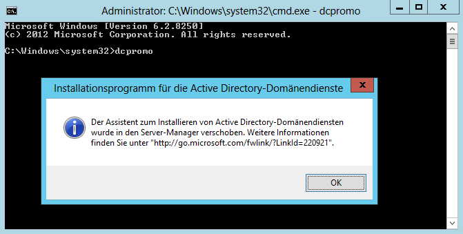 Dieser war bis zuletzt eine einfache und schnelle Möglichkeit, den Vorgang für die Installation von Active Directory zu starten. Seit Windows Server 2008 ist seitens Microsoft der Weg über den Server-Manager oder die PowerShell vorgesehen.