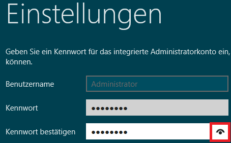 Beim Eingeben des Administrator-Kennworts besteht die Möglichkeit, sich das Kennwort durch einen Klick auf das Symbol am Ende der Zeile anzeigen zu lassen.