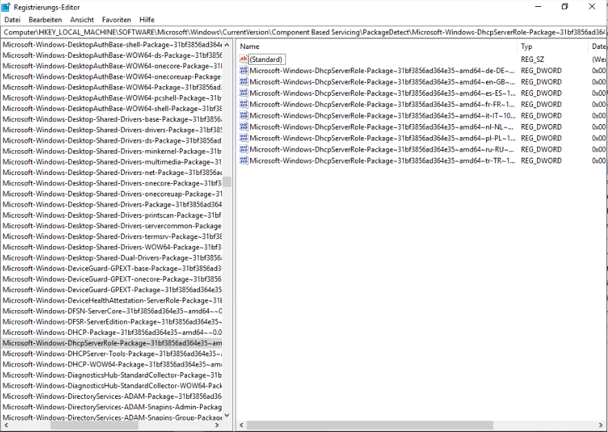 Interessant war allerdings der Vergleich, hier bei der DHCP-Serverrolle die sich nicht installieren lies, das es Differenzen bei den Verweisen auf Sprachpakete in der Registry gab: