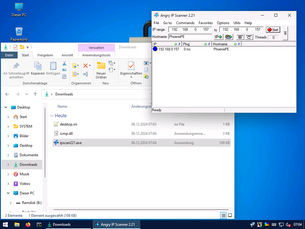 D.h. man muss diese “icmp.dll” zusammen mit der “ipscan.exe” dem WinPE zur Verfügung stellen. Es reicht aus, wenn beide Dateien im gleichen Ordner sind. Beim Start erscheint zwar nun eine andere (Fehler-)Meldung, die man allerdings ignorieren kann. Der IP-Scan als solches funktioniert (weiteres habe ich bislang nicht getestet).