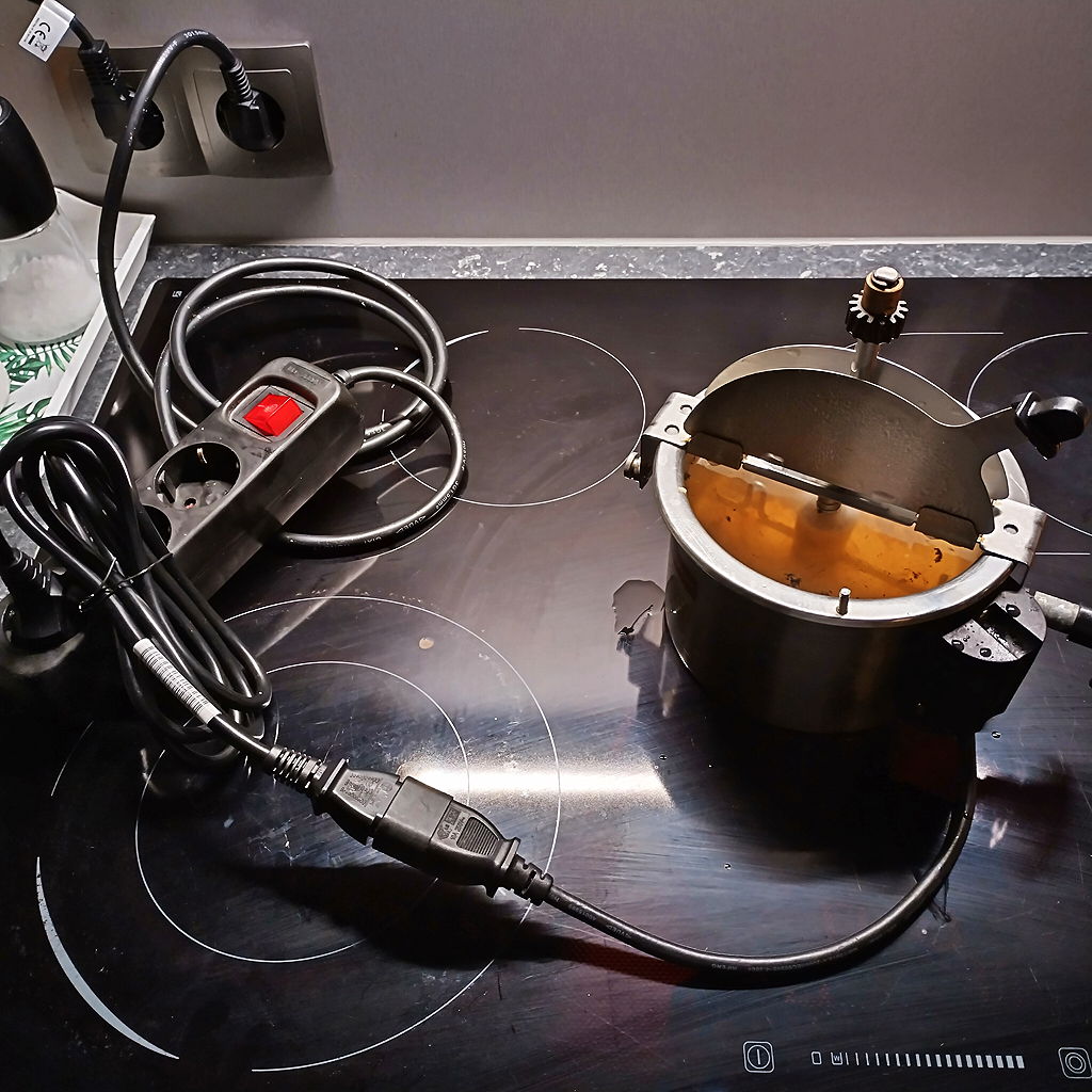 Den Topf kann man mit einem üblichen Kaltgerätkabel (z.B. vom PC) anschließen. Wie man auf dem Bild sieht verwende ich zusätzlich noch eine Steckdosenleiste mit Schalter. Bei uns wird der Topf so sehr sauber, es bleiben nur 2-3 sehr kleine Stellen mit sehr hartnäckig Angebranntem zurück.