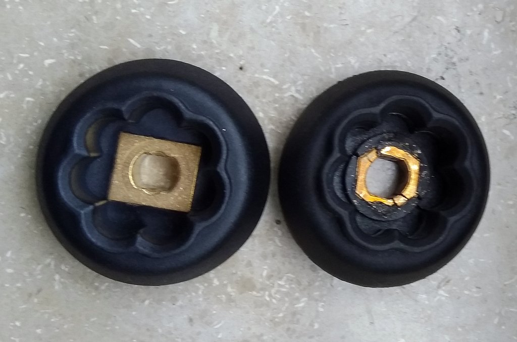 Links das neue und rechts das defekte ältere Teil. Der Kupferkern ist ungleich größer und in anderer Form, das macht Hoffnung, das es länger hält. Ferner gibt es für die Oberseite jetzt eine Abdeckung.