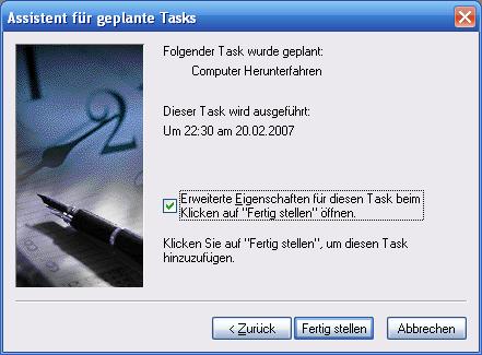 "Erweiterte Eigenschaften für diesen Task beim Klicken auf "Fertig stellen" öffnen." anklicken und auf "Fertig stellen" klicken.
