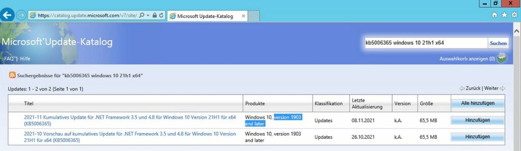 Um heraus zu finden, unter welches “Produkt” Microsoft ein bestimmtes Update einordnet kann man auf den Microsoft Update-Katalog zurückgreifen. Dort gibt man im Suchfeld das Update und die aktuell verwendete Betriebssystemversion ein. Im Ergebnis kann man dann in der Spalte “Produkte” den für den WSUS passenden Eintrag ablesen: